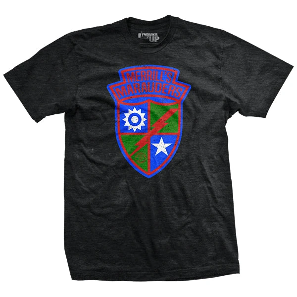 5307th Composite Unit (provisional) AKA Merrill’s Marauders has the type of history that you think would only exist in the movies. The commander of the Unit, Frank D. Merrill, was so tough that the man had not one, but two heart attacks during a campaign and refused to be evacuated from the battlefield. Camp Merrill, where what most Ranger Students feel is the most arduous phase of training, the mountain phase, is conducted, is named after him. In five months Merrill?s Marauders fought five major engagements through some of the densest jungle on the planet, traveling farther than any other Army jungle unit ever had. Conditions were so poor for the Marauders that by the end of the campaign only two of the 2,997 men were not hospitalized for wounds or severe sickness. Just surviving that would have been a major feat of human endurance, but these men didn’t just endure, they kicked ass. As a mere example, in their final major engagement, Myitkyina Airfield, the significantly outnumbered Marauder’s killed over 3,800 Japanese fighters. They brought the fight so hard and so aggressively to the Japanese in Burma that every man in the unit was awarded at least a Bronze Star for heroism during the campaign. The unit also received the extremely rare honor of being awarded the Distinguished Unit Citation. The Marauders are the direct forefathers of the modern 75th Ranger Regiment, and the Regimental beret flash’s colors incorporate the colors of the Marauder’s combat teams. We’re privileged to be able to finally do a shirt in their honor.
